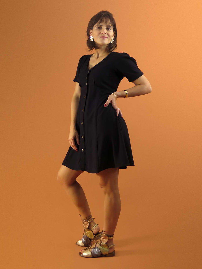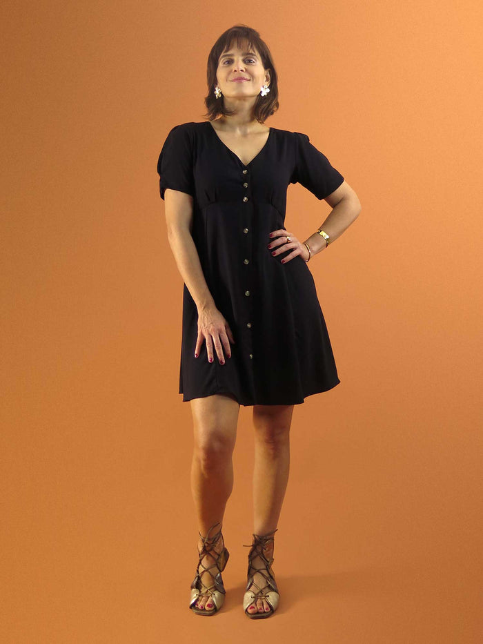 Vestido curto, com caimento confortável e corte acinturado. Possui um laço atrás que permite regular deixando a peça mais soltinha ou mais justa e acinturada. 💫 As mangas dão um...
