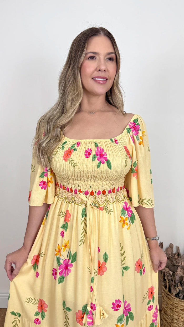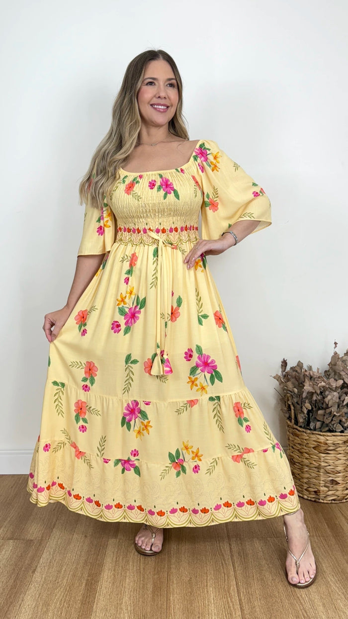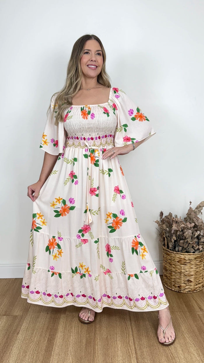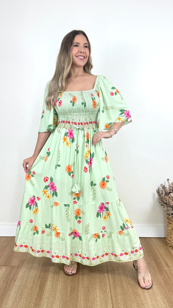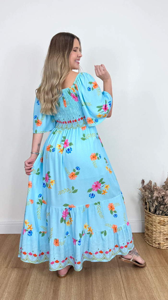 Vestido em viscolinho com caimento leve, toque confortável e proposta feminina para o dia a dia. Possui forro, decote reto e mangas com elástico nos ombros. O lastex na frente e nas costas garante melhor ajuste ao corpo. Modelo longo, versátil e elegante.